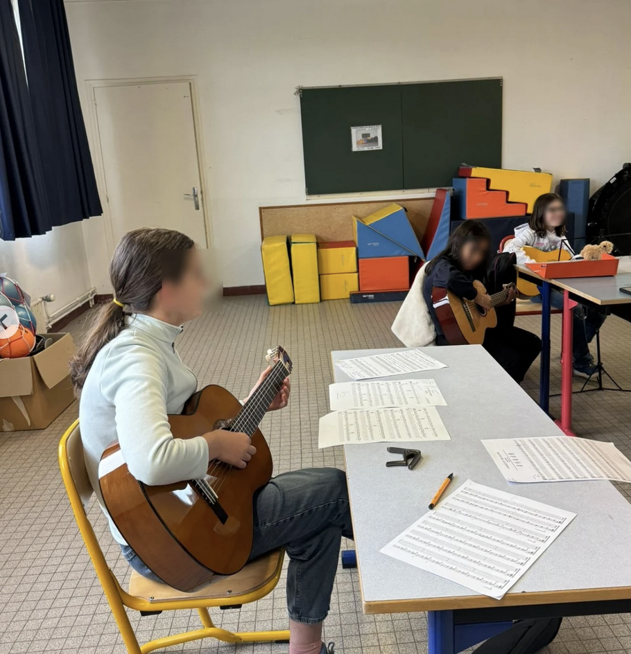 L’apprentissage de la guitare se fait principalement à partir de morceaux adaptés au niveau et aux envies des élèves. L’idée est avant tout de leur donner envie de jouer et de progresser avec plaisir.